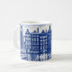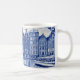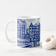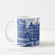 Coffee mug in a Delft Blue style with an image of Amsterdam. Generative content with photography by Velvet Escape.
