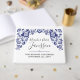 Klassisk bröllop-design inspirerad av Delfts Blauw (Delft Blue). Fira din speciella dag i traditionell nederländsk stil! Koboltfärger i elegant och auktoritärt detaljerade prydnadsblommor ger en tidslasticerad ton till alla contemporary firande. ・ Anpassa den! Följ mallen eller klicka på knappen "Anpassa" för att göra djupgående ändringar, t.ex. teckensnitt, storlek text, färg och placering. ・ Samordna det! Bläddra i Delfts Blauw-samling i Bröllop för alla matchande produkter, inklusive välkomsttecken, mottagningsfavörer och annat.