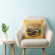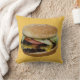 Fotografi av en utsökt ostburgare på anpassadets gult bakgrund. Baksida av anpassadets gult för matchande kuddar.