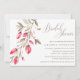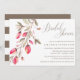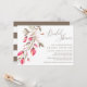 Trendig Rustic stil inbjudningskort för möhippa med en gren av blommor med rosa i blomma och vit och grått stripe mönster på kortets lämningar. Dessa inbjudan är perfekter för en land-, bondgård-, trädgårds-, party- eller barnyard- eller stil-möhippa.