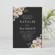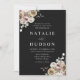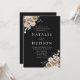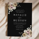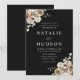Bröllopappningar för blommigt under elegant med information om bröllop som visas i vitt brev med blommigt i hörnen på en svart bakgrund. Vinterblommorna har en färg-palett med dammig ro, ljus rosa, elfenben och mjuk gyllene gult med eukalyptus löv och vintern bladbete i skalad grönt och grönt av rik.