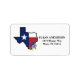 Öka dina kuvert och personliga artiklar med fantastisk Texas returetiketter. Texas statlig flagga är med i Texas-formen tillsammans med den vackra statsblomman, Bluebonnet.