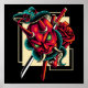 En levande, stiliserad illustration som skildrar en häftig, röd Oni-mask omgiven av en kokt orm och en korsad katana. Ett blomstrande röd ros tillför en viss kontrast och symbolik. Utformningen är uppbyggd av ett kvadratiskt gräns, vilket förbättrar dess feta och dramatiska estetik.