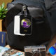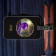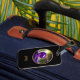 Stilfull design för resväskemärke med vacker AI-genererad fantasidigital konst av en magisk / mystisk ametistkristallklot som svävar i en skog. Rund grafik med guldbård på svart bakgrund. Anpassa med monogram eller namn i modern scriptfont