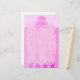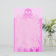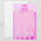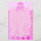 Bekymrad stil två-tonad rosa skalle och crossbones. Vassa huggtänder. Den enkla skallekonstdesignen för Halloween eller några tajmar. Tomt brevpapperpapper med stylized flammar gränsen.