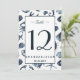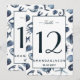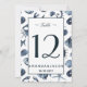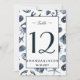Elegant och nautiskt bröllopsbordskort inspirerat av en kuststil med ett blått och vitt färgschema med sjöhäst, sanddollar, snigelskal, krabba och sjöstjärna, anpassad text och bröllopsdetaljer