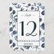 Elegant och nautiskt bröllopsbordskort inspirerat av en kuststil med ett blått och vitt färgschema med sjöhästar, sanddollar, snigelskal, krabba och sjöstjärna, anpassad text och bröllopsdetaljer