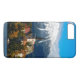 iPhoneskyddsfodral med den små ön med kyrkan som omges av träd i höst färger i sjön som blödas med i bakgrundssnön på, nå en höjdpunkt av den Julian alpernan i höst i Slovenien.
