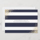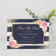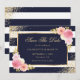 Elegant: Blått och vitt, randigt, blommigt bröllop spara datum-kort med vattenfärg, rosa blommor och gyldad grönsak. Matchande objekt är tillgängliga.