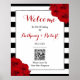 Den chic moderna lyxiga bröllopssamlingen har en klassisk svart-vit randig bakgrund som accentueras med vackra rubinröda rosor och en falsk silverfolierad ram. Denna välkomstskylt är enkel att anpassa och kommer att vara den perfekta skyltningen för alla bröllop, möhippa, födelsedagsfest, förlovningsfirande eller någon annan speciell tillställning. Mallens text och QR-kod är lätta att anpassa för att göra denna skylt unik för just er speciella tillställning.
