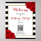 Den chic moderna lyxiga bröllopssamlingen har en klassisk svart-vit randig bakgrund som accentueras med vackra rubinröda rosor och en falsk guld folierad ram. Denna välkomstskylt är enkel att anpassa och kommer att vara den perfekta skylten för alla bröllop, brudfest, födelsedagsfest, förlovningsfirande eller någon annan speciell tillställning. Malltexten och QR-koden är lätta att anpassa för att göra denna skylt unik för din speciella händelse.