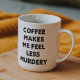 Kaffe kan förändra sinnesstämningen; detta tolkas humoristiskt i texten på raden "Kaffe får mig att känna mig mindre mördery". Det fuskande antyder att konsumtionen av kaffe avsevärt har förbättrat talarens sinnesstämning och minskat deras oro. Det blandar realistiska erfarenheter av att förlita sig på kaffe för att få dig att må bättre med mörk humor. Perfekt-gåva till tillfälle som Mors dag, Fars dag, Thanksgiving, Påsk, jul eller nyår, Halloween, Julafton, Thanksgiving, St.Patrick's day, juli 4:e födelsedagen.