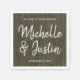 Välkomna till våra bröllop-blöjor med trendig-handskriftstext över bilden av gammal träbakgrund.