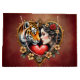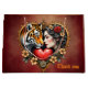 Kärnan i den gömt vildmarken, en stor tiger och en kvinnas profil blandas på ett konstgjort sätt. Båda motiven är inbäddade i en elegant, hjärtformad ram, som undervärderar den romantiska stämningen. Ram är rikt dekorerat med känsliga blommönster som harmoniskt vind runt och ger det en lekfull, fantasifull beröring. Blommorna är ett ljust rött hjärta som symboliserar kärlek och passion.
