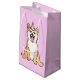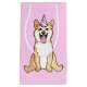 Födelsedagen eller party-anslår gåvan hänger lös med den gulliga teckningen av en fluffig ljus - bryna le den lyckliga shibainuhunden som ha på sig en vit, och görade randig rosor festar hatten som skrivs ut på ett ljust - rosa bakgrund.