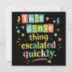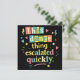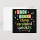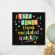 Rolig retrotypografi med färgglada bokstäver och lekfulla symboler som visar hur en enkel dansstund förvandlas till något oväntat. Ett humoristiskt uttalande för alla som älskar att dansa, roliga situationer och spontana ögonblick.