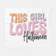 Den här lekande och färglösa designen innehåller frasen "Denna flicka Kärlek Halloween" i fet, stil-återutskrift. Texten är uppdelad i tre linjer, där varje rad har en egen färg-palett. "DETTA" i ord är i en mjuk, texturerad orange, "GIRL" i en pastelllila och "KÄRLEK" i en ljus, bubblgum rosa. Ord "Halloween" är skrivet i en jämn, svart kursiv stil som ger kontrast och balans till designen. Varje brev har en något rundad, bubbelformad form som ge utformningen av en roligt och en vismisk känsla, perfekt för att fira Halloween-själens festiva och ljusa själ.