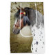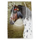 Original digital konst av Jayne Wilson med ett huvudporträtt av en Appaloosa-indianponny i ett rött huvudställ med förgyllda detaljer och fjädrar.