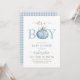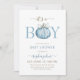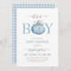 Den lilla dockan är på vägen mot en blå babydusch. inbjudningar