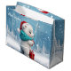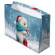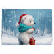 Den lilla söta björnen baby med julhatt och julklapp.björnen har fluffy päls och stort runt ögon den gnistran med nyfikenhet och glädje. Hans lilla tassar är förtjust i nuet som om han just hade upptäckt det.