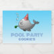 Den lilla val har födelsedag bassäng party med en party hatt på huvudet.