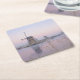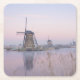 Kustfartyget med en saga landskap med gammala windmills i den mjuka pastellet lätt av en vintersoluppgång med is på floden och frost på vasserna på en kall morgon i Kinderdyke, Nederländerna.