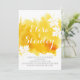 Modern bröllopsinbjudan till abstrakt stänk gult med en handmålad vattenfärgsfärg stänk med struktur i tonerna gult och bränd orange, kapla löv i vitt med blek-gulter och text i vitt och grått. Den här inbjudan till bröllopsmötet för elegant och snyggt avslappnad en fullständig perfekt av anpassadet för bröllop vår, sommar eller fall/höst. Observera att detta bara är en vattenfärgsbild och inte en riktig struktur. För bästa resultat, välj filt eller annat pappert.