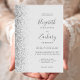 Den här elegantens lämnat kant har en modern bröllopsinbjudan i silver i glitter. I anpassadet kombineras grått-handskrift, kopparplåt och kursivt typsnitt på blekens grått-bakgrund. Den omvända sidan har en matchande grått- och silver glitter-design.