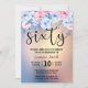 Snygg Modern 60:e födelsedagsinbjudan. Utformning av vattenfärgsbakgrund med guld glitter och blommigt inslag i rosa och blått.