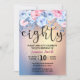 Snygg, modern 80:e födelsedagsinbjudan. Utformning av vattenfärgsbakgrund med guld glitter och blommigt inslag i rosa och blått.