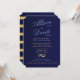 En modern bröllopsinbjudan på en marin blå bakgrund med guld rand på motsatt sida. Förbannad med rullan guld löv. Namnen på briden och trimmen skrivs i ett elegant-skript i en ljusblå nyans, en harmonisk blandning av klassik och contemporary. Detta teckensnittsval ger inbjudan en känsla av respit och modernitet.