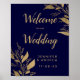 Välkomna er gäst till er bröllop med denna blandning mellan modern och vintage stil med en handmålad vattenfärg gult guld folie botaniskt gren med löv och blommor på en redigerbar marin blå bakgrund.