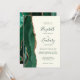 Den här elegantens lämnat kant har en modern bröllopsinbjudan och en framväxande grönt vattenfärgsagat gräns trimmad med faux guld glitter. I anpassadet kombineras handskrift, tryckplåt och kursivt typsnitt i grönt i emerald på en elfenbensbakgrund. Den omvända sidan har en matchande framväxande grönt och guld agate-design.
