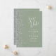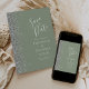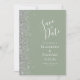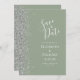 Det moderna bröllop spara datum-kortet från elegantens lämnat kant har ett silver faux glitter gräns. Anpassadet kombinerar vit handskrift, tryckplåt och kursivt typsnitt mot bakgrund av grönten. Den omvända sidan har en matchande sidstorlek och silver-grönt.