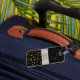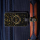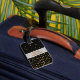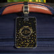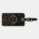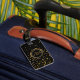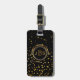 Snyggten, svarten och den guld- monogrammed initialer reser bagagemärkren. Klassikerstil, den guld- monogramen för 3 brev beklär på. Stilsortsstil och färger kan ändras. Centrerat på guld- metallisk look för svart och för faux cirkla. Pricker svart bakgrund för heltäckande med guld- konfettiglitter för faux spritt över det bästa och nedersta. Baksida har samma utskrivavet fauxguld att omkullkasta konfettiglitter och svartbakgrund med DIY-textmallen för att tillfoga namn och telefonnummer eller annan information om kontakt. Notera: Bilder skrivs ut. Inte faktiskt glitter, konfettiar eller metall. Flott sofistikerad bagagemärkre.