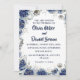 Bröllopbjudan har en elegant blommigt gräns i mörk blått ro och ömtåliga blommor, accentuerad med silver och guld. Den här arrangemanga omger en vit elegant, perfekt för text. Kombinationen av mörk blått silver och guld färg och ömtåligt löv skapar en tidlös, sofistikerad beröring. En matchande blommigt arrangemang läggs till i baksidan för att överföra det övergripande temat.
