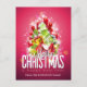 Helgdag vykort med en coola julillustration. I texten står det God jul & Gott nytt år. Designad med en träd-formad mound av presenter med festive snöflingor, stjärnor, jultomter och glatt tittar gnistor. Bakgrunden är en pulserande rödaktig rosa färg.