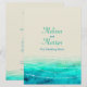 Vacker blå grönt målad havsyta med vinkar gnistra överläggningsmeny för bröllop. En vacker strand, ett kusthav inspirerat av contemporary, bröllop-meny med ett unikt stiliserat, hand-vattenfärdigt hav på en färg-papper. Perfekt för ett modernt strandbröllop. Redigera den här menyn med ord. Unik designad och målad av Sarah Trett.