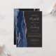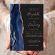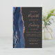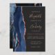 Den moderna bröllopsinbjudan från elegantens lämnat kant har en marin blå vattenfärgsagat gräns som trimmas med faux ro guld glitter. Anpassadet kombinerar handskriftsskript för ro rosa med mönsterfärg och kursivt typsnitt på en skiffersvart bakgrund. Den omvända sidan har en matchande marin blå utformning och ro guld-agatdesign.