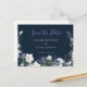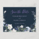 Det här är en blå blommigt för att spara datuminbjudan efter vykort. Konstruktionen användor blå, grönt, elfenben och silver grått vattenfärgade botaniska ämnen ovanpå en djup och chic marin blå bakgrund. All text och grafik är anpassade. Kontakta designern om du har några frågor om den här designen eller någon av de andra produkterna i samlingen.