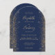 Den här eleganten är en modern bröllopsinbjudan med guld faux glitter sida gräns. Anpassadet kombinerar handskrift, rityta och kursivt typsnitt i blek guld-färgad med en marin blå bakgrund. Den omvända sidan har en matchande marin blå och guld glitter-design.