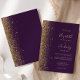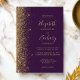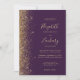 Den här elegantens lämnat kant har en modern bröllopsinbjudan i guld i glitter. Anpassadet kombinerar handskrift, rityta och kursivt typsnitt i blek guld-färgad med mörkens lila. Den omvända sidan har en passande lila- och guld glitter-design.