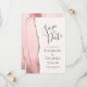 Det moderna bröllop spara datum-kortet från elegantens lämnat kant har en vattenfärgad rosa i gräns som trimmas med faux guld glitter. Med anpassadet kombineras grått-handskrift, kopieringsskylt och kursivt typsnitt på blekens bakgrund. Den omvända sidan har en passande och guld agate-design.