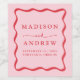 Lägg till en personlig till din bröllopsmottagning, förlovningsfest eller repetitionsmiddag med anpassningsbarna Modern Rosa och Röda Vågigt vin Ram. Utformningen visningar namn, bröllop-datum och bröllop i fet röd text omgiven av en röd vågigt gräns som kontrasterar mot en ljus rosa bakgrund. Etiketterna från vin samordnar sig med vår moderna Vågigt Ram bröllop.