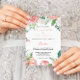 Denna moderna rosa tropiska blommigt Spanska bröllopsinbjudan är perfekt för ett destinationsbröllop. Utformningen har vackert handmålad vit, rosa, blommor med grönt löv, skisser av nåd och elegans.