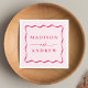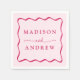 Lägg till en snyggt till din bröllopsmottagning, repetitionsmiddag, förlovningsfest eller möhippa med den moderna Rosan Vågigt napkins från Ram bröllop. Visningen för retro-bröllop-napkins parets namn i fet rosa, omgiven av en rosa, vågigt gräns kontrasterande med en ljus rosa bakgrund. Napkins från trendig bröllop var designade att samordna med vår moderna Vågigt insamling från Ram bröllop.