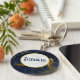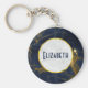 En nyckelkedja med modern elegant marmor blå och guld. Överst är en cirkel med faux guld-folie gräns med personlig inuti.