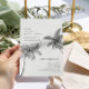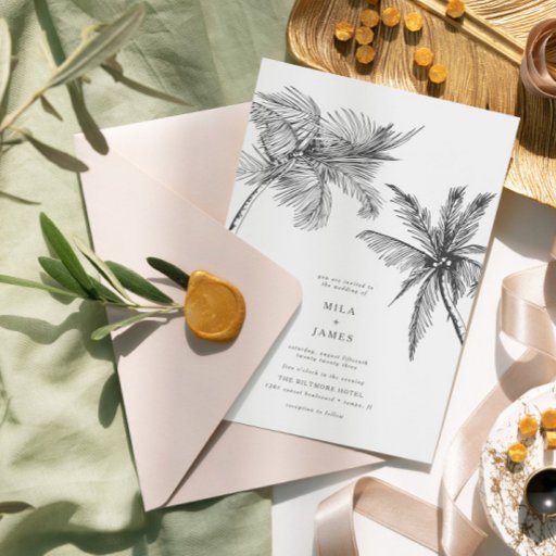 Inbjudan dina vänner och nära vänner från långt och brett till ditt elegant-badbröllop med vår moderna minimala inbjudan till tropisk bröllop. Denna konstruktion har en minimalistisk konst av typen handflatan träd som helt och hållet är anpassadet i färg. Vår contemporary tropiska bröllop-samling är perfekt för en strand- eller destinationsbröllop.