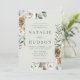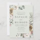 Elegantens bröllopsinbjudningar under vintern blommigt med uppgifter om bröllop som visas i mörk grönt bokstäver i kapslade insidan av en boho blommigt ram med en ljusskygg grönt bakgrund. Vinterblommorna har en färg-palett med dammig ro, ljus rosa, elfenben och mjuk gyllene gult med eukalyptus löv och vintern bladbete i skalad grönt och grönt av rik.
