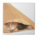 Den orange tabbykattungen ser ut från den gammala favorit- leksaken som det bruna papperet hänger lös det keramiska fotoet belägger med tegel